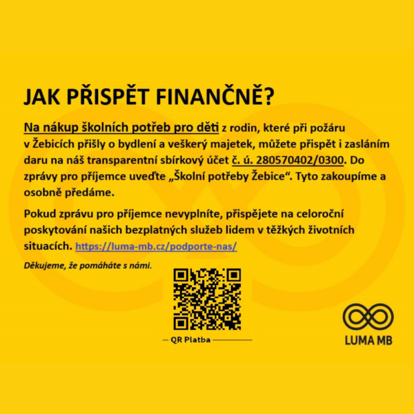 Na nákup školních potřeb pro děti z rodin, které při požáru v Žebicích přišly o bydlení a veškerý majetek,můžete přispět i zasláním daru na náš transparentní sbírkový účet č. ú. 280570402/0300. Do zprávy pro příjemce uveďte „Školní potřeby Žebice“. Tyto zakoupíme a osobně předáme.
